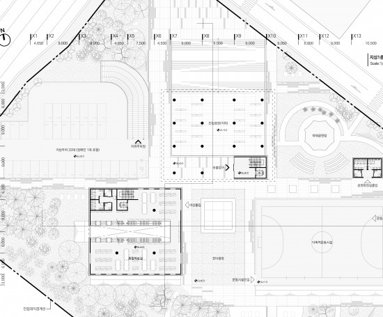 도서관, 문화교육시설, 다목적 운동시설, 야외공원장, 지상주차장의 소규모 거점 계획으로 기존 공원 토지 활용도를 유지하고 단일건물이 아닌 주요 시설별 분산 배치를 통하여 자연스레 도시, 기존 공원 시설(주요 수목, 휴식 및 운동기능, 야외공연장)과 도서관이 잘 어우러지도록 의도하였다.